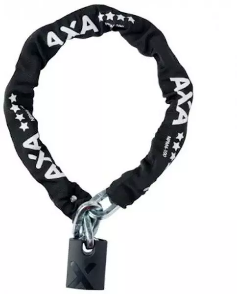 Kjedelås fra AXA. Kjedet er dekket av neopren. Lengde 130 cm. Sikkerhetsnivå 20. Hengelåsen er laget av armert stål med en sylinder som ikke kan bores ut.
